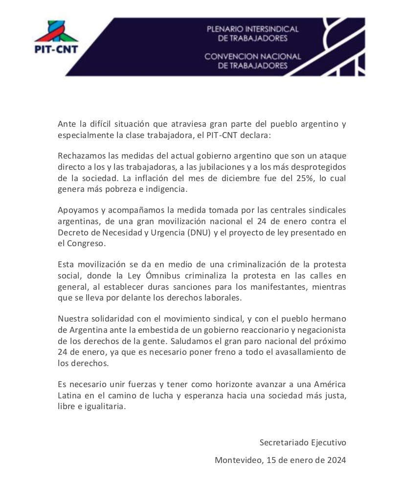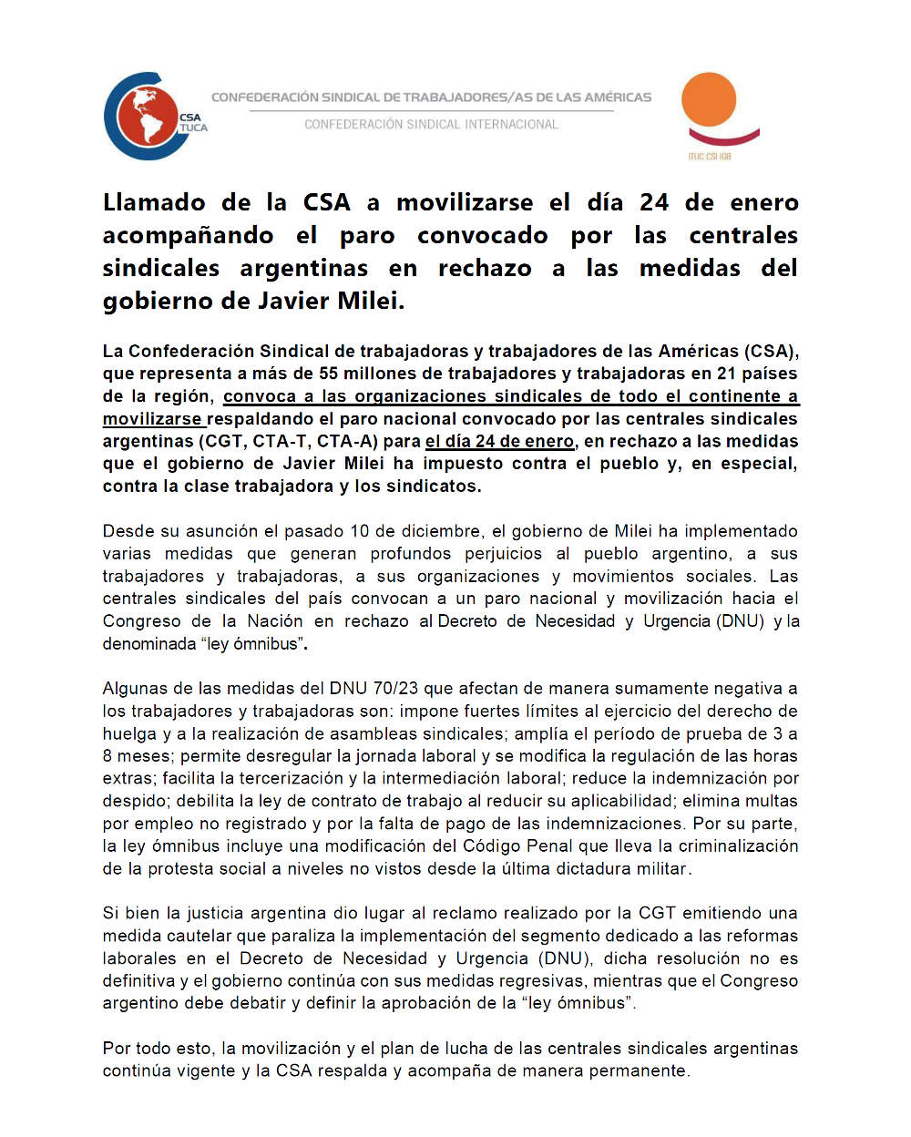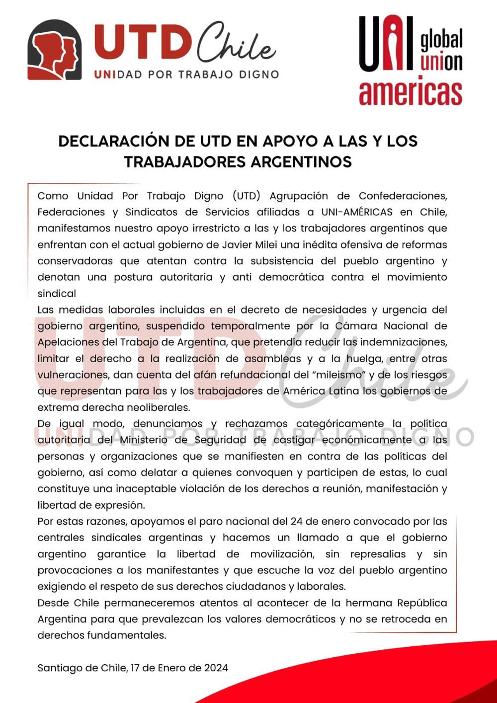 La Jornada de Lucha y Paro Nacional convocado por la CGT para este 24 de enero sigue sumando adhesiones internacionales tales como el apoyo brindado por IndustriALL Global Union, e innumerables organizaciones del mundo del trabajo tales como la Intersindical francesa en Argentina y la UTD (Unidad por Trabajo Digno) de Chile.